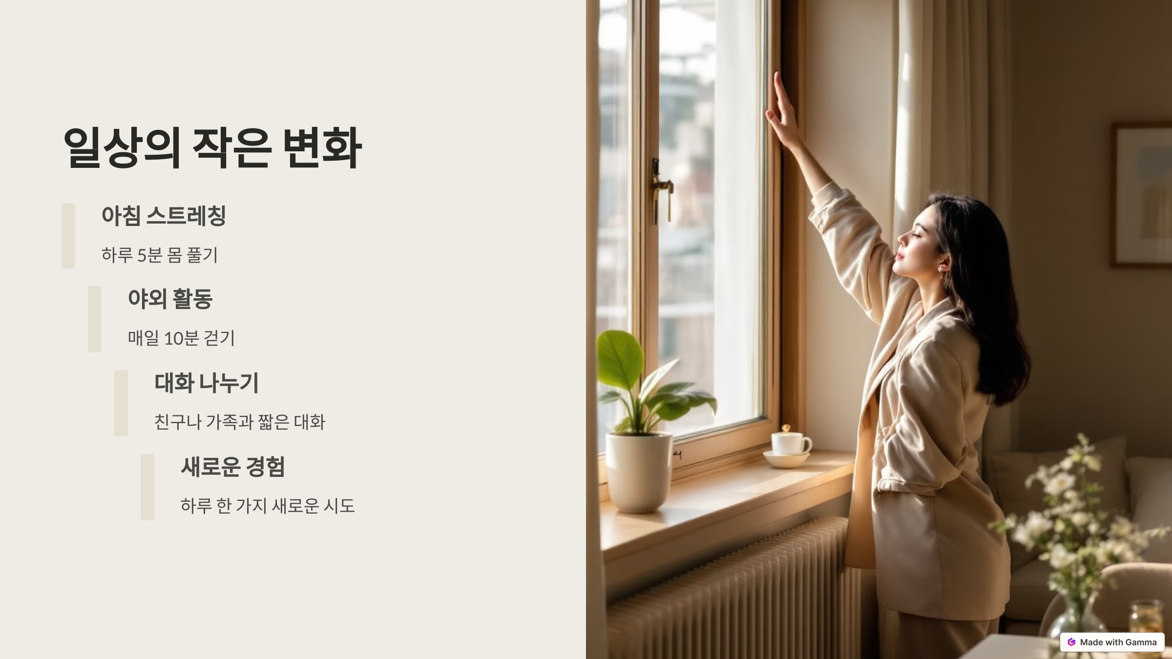 무기력증은 현대인의 흔한 고민이지만, 2주 이상 지속된다면 가볍게 넘기지 말고 우울증의 가능성을 염두에 두어야 합니다. 생활 습관 개선, 영양 관리, 심리적 접근법 등 다양한 방법을 시도해보고, 필요하다면 전문가의 도움을 구하는 것이 중요합니다. 😊